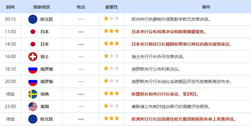 汇通财经APP讯——4月28日,投资者需要关注的重点数据:日本4月东京CPI年率,日本3月失业率,法国第一季度GDP年率初值,德国3月季调后失业率,欧元区第一季度季调后GDP季率初值,德国4月CPI年率初值,美国3月PCE物价指数年率,美国3月个人支出月率,加拿大2月季调后GDP月率,美国4月芝加哥PMI。需关注的大事包括日本央行利率决议;欧盟财长和央行行长会议的举行;欧洲央行行长拉加德在欧元集团新闻发布会上发表讲话。当天,中国郑商所、上金所、上期所、大商所因劳动节,不进行夜盘交易。