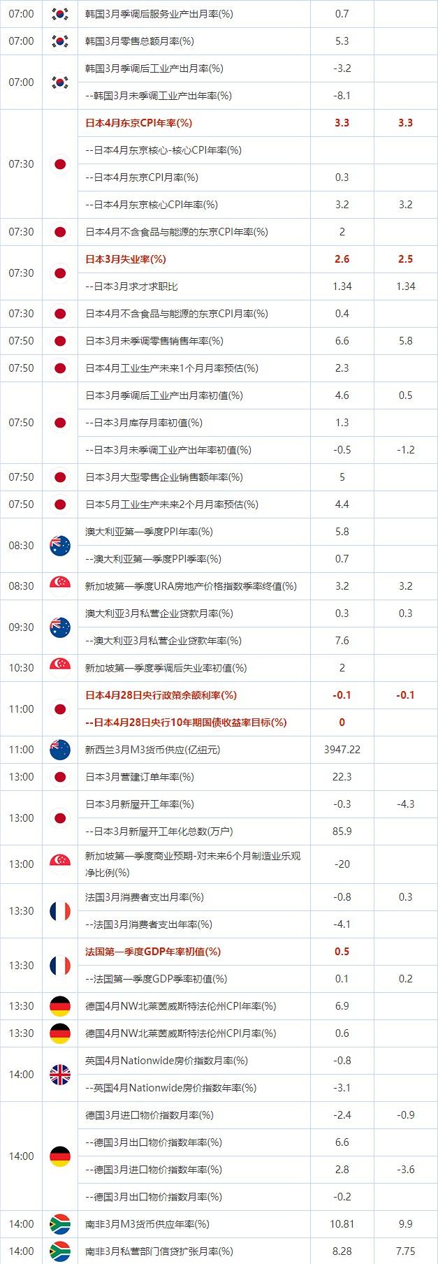 07:30 日本4月东京CPI年率(%) , 前值 3.3 , 预期值 3.3 , 公布值:待发布