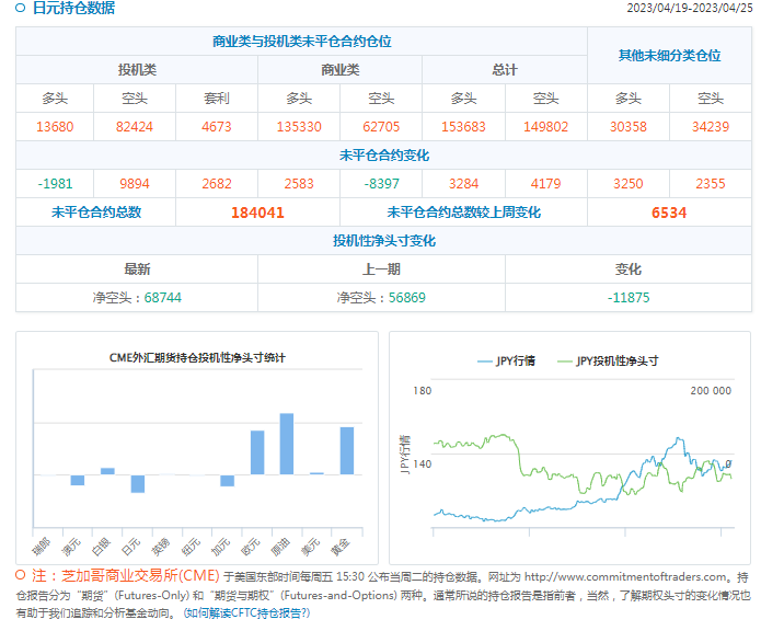 截至4月25日当周,瑞士法郎净空头头寸减少3656手,英镑净多头头寸为5839手,欧元净多头头寸为169400手,日元净空头头寸减少68744手。