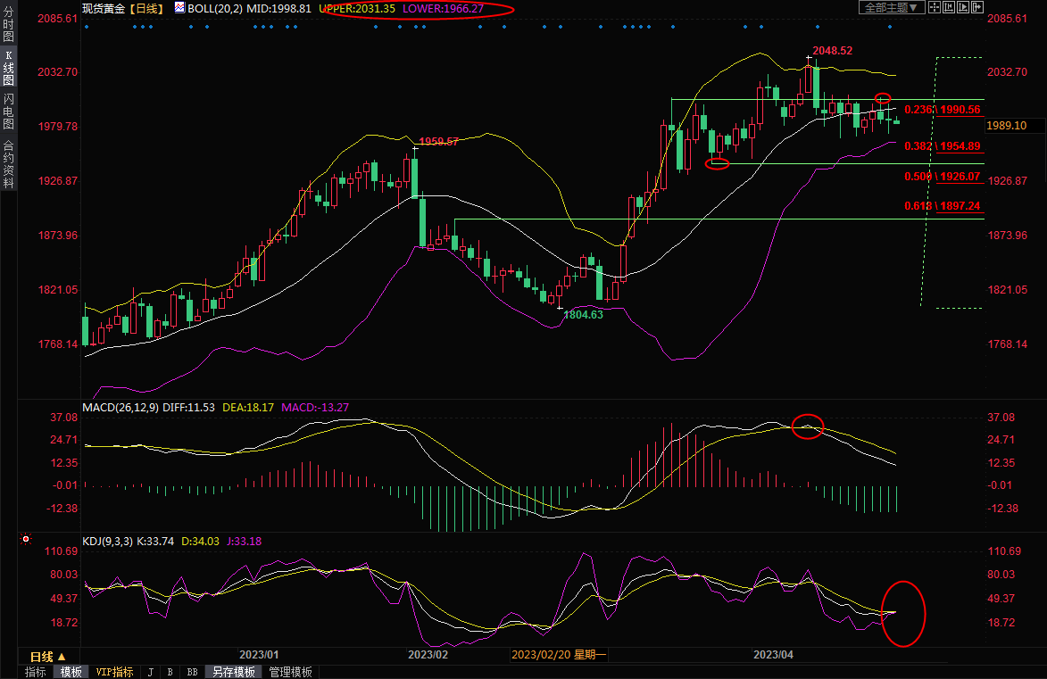 日线级别:高位震荡;布林线高位收口后接近水平运行,后市走势需要关注布林线轨道1966.32-2031.35区域突破情况,目前金价承压于布林线中轨下方,MACD死叉良好运行,短线偏向试探布林线下轨1966.32附近支撑,如果失守该支撑,则增加后市看空信号;进一步支撑参考1960关口,1805-2048涨势38.2%回撤位在1954.89附近,3月27低点支撑在1943.93附近。