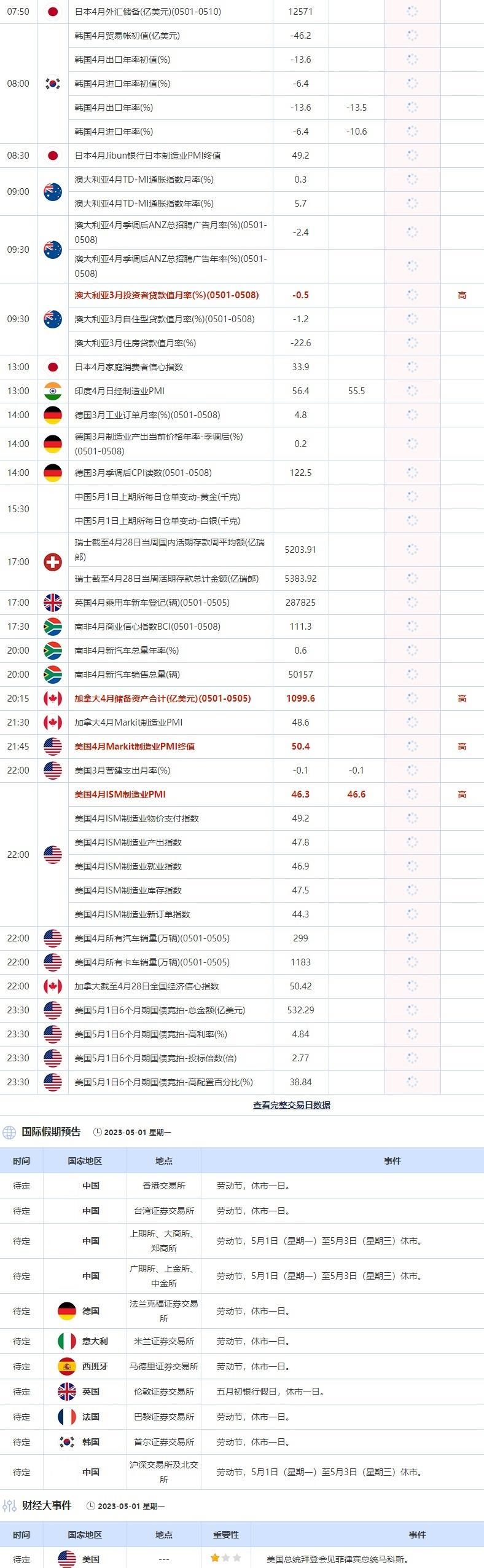 汇通财经APP讯——5月1日,投资者需要关注的重点数据:澳大利亚3月投资者贷款值月率,加拿大4月储备资产合计,美国4月Markit制造业PMI终值和美国4月ISM制造业PMI。大事方面,需要关注劳动节假期全球各大交易所的休市公告。