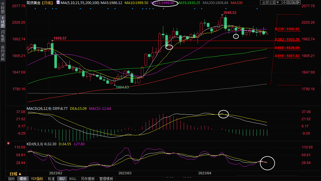 整体来看,美联储本周利率决议前,美元和美债收益率偏向强势,金价隔夜再度冲高回落后,士气受挫明显,日线级别21日均线对金价压制明显,5日均线和10日均线初步拐头向下,MACD死叉信号延续,KDJ重新结成死叉,短线金价下行风险有所增加,可能会跌破4月19日触及的近一个月低点1969.14附近支撑,并进一步跌向1934-1950区域。