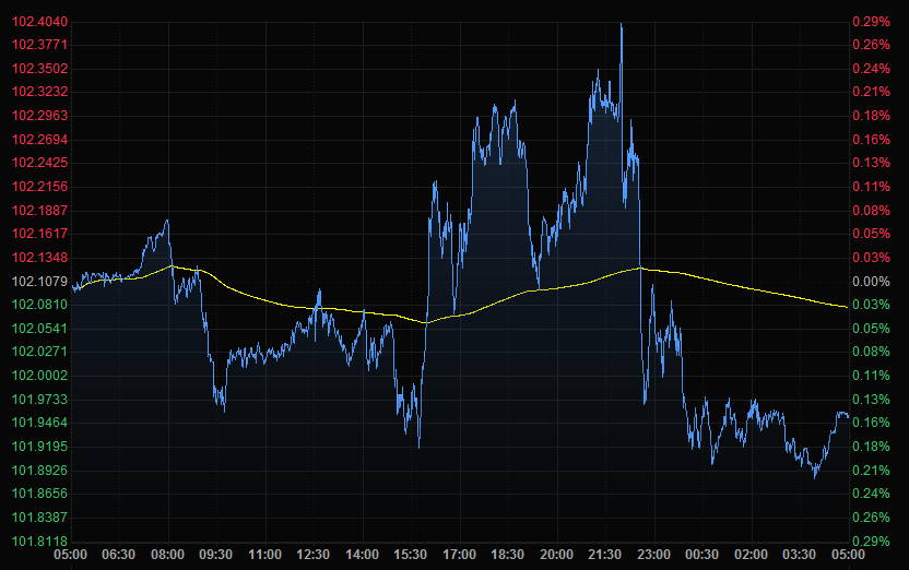 美元指数周二下跌0.15%,至101.93,稍早曾达到102.40,为4月11日以来最高。周三亚洲时段,美元指数延续隔夜跌势,一度创两个交易日新低至101.69。