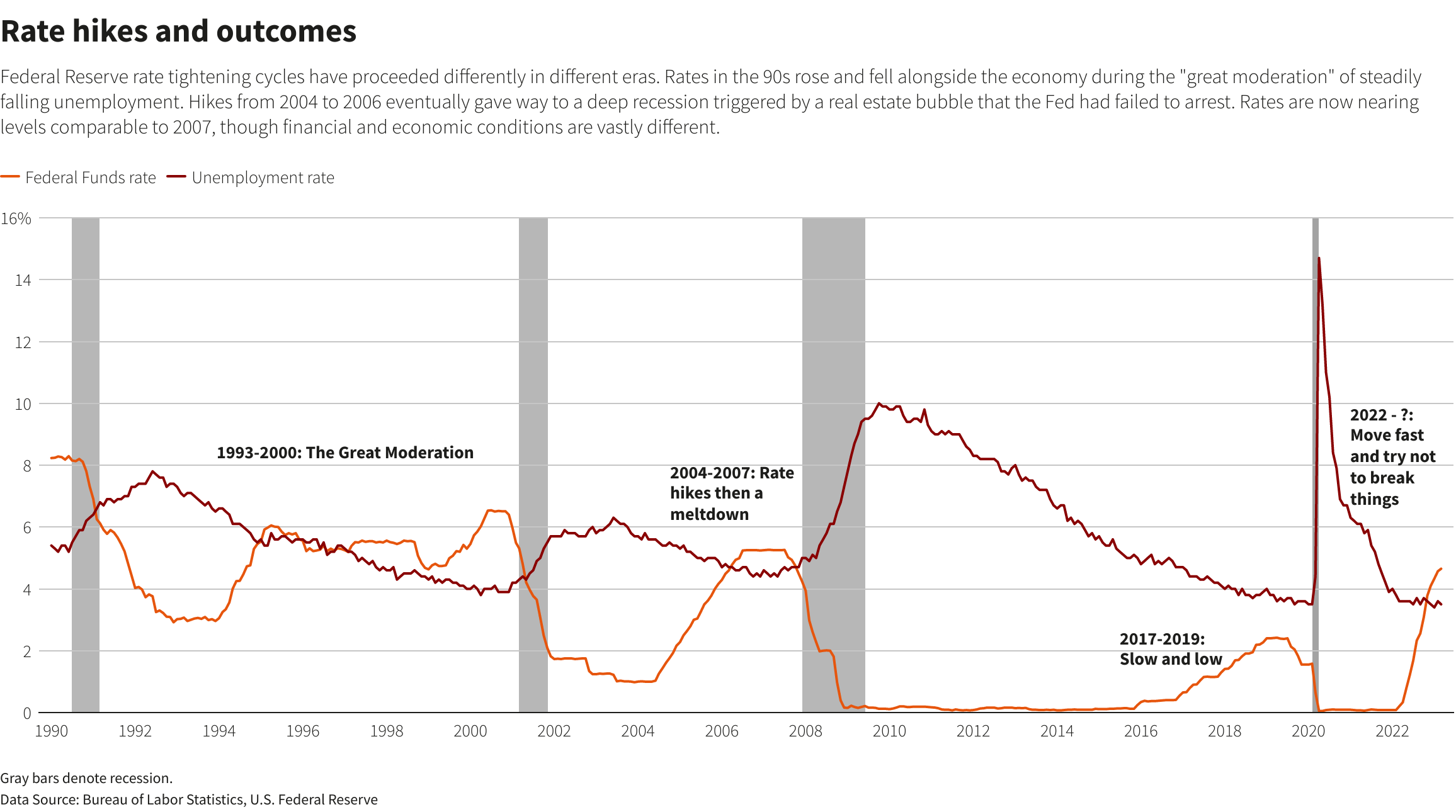 对这一判断的检验现在开始,有两个可比较的时刻可以衡量——2004-2006年的加息周期以灾难性的衰退结束,以及1990年代的“大温和”,当时美联储交替加息和降息以应对近十年的持续增长。