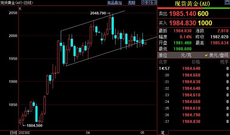 北京时间14:58,现货黄金上涨0.16%至1984.83美元/盎司;COMEX期金主力合约上涨0.07%至1993.5美元/盎司;美元指数下跌0.11%至101.995。