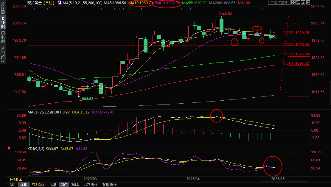 日线级别:震荡;MACD死叉,KDJ重新死叉,21日均线对金价形成压制,5日均线和10日均线初步拐头向下,隔夜金价冲高回落录得带上影线的阴线,暗示上方卖压较强,短线金价略微偏向震荡下行,初步支撑在上周低点1974.04附近,4月19日触及的近一个月低点支撑在1969.14附近,布林线下轨支撑也在该位置附近,因为布林线收口且接近水平运行,如果跌破该支撑,则增加后市看空信号。
