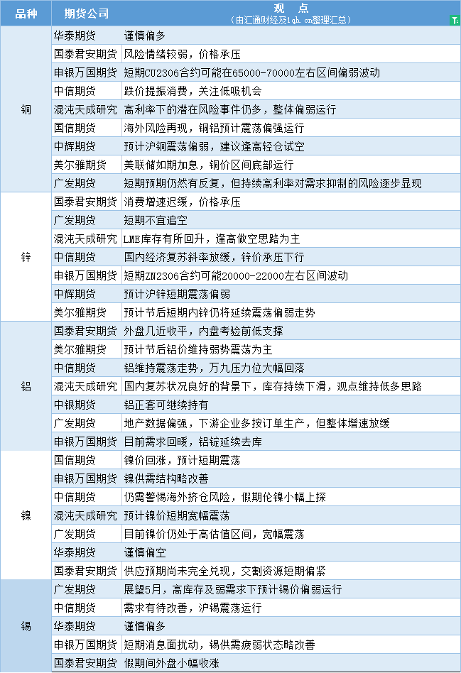 汇通财经APP讯——期货公司观点汇总一张图:5月4日有色系(铜、锌、铝、镍、锡等)