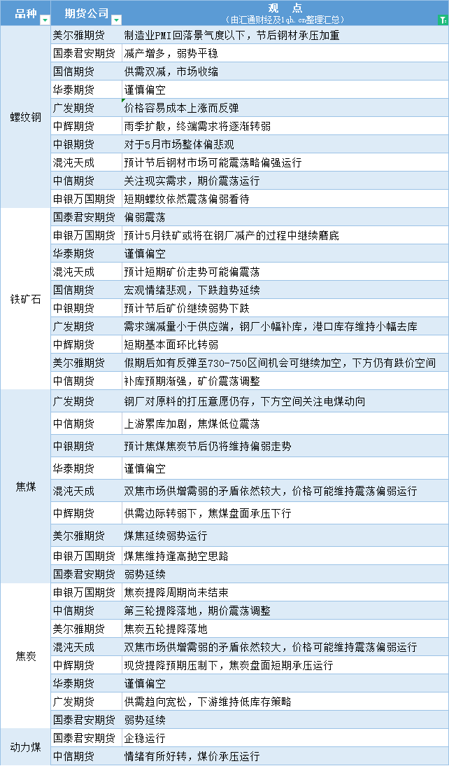 汇通财经APP讯——期货公司观点汇总一张图:5月4日黑色系(螺纹钢、焦煤、焦炭、铁矿石、动力煤等)