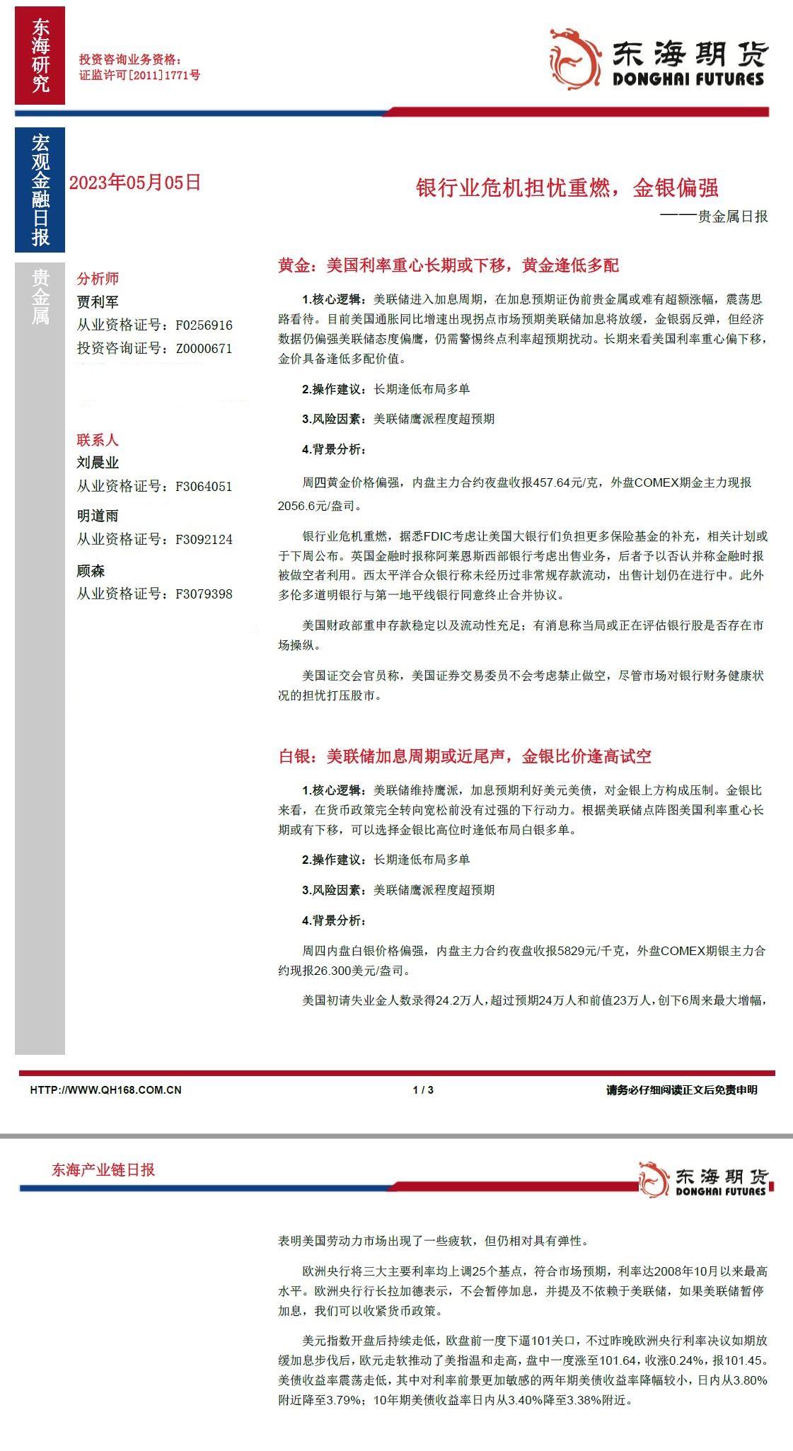 标题:【东海期货5月5日产业链日报】贵金属篇:银行业危机担忧重燃,金银后市偏强
