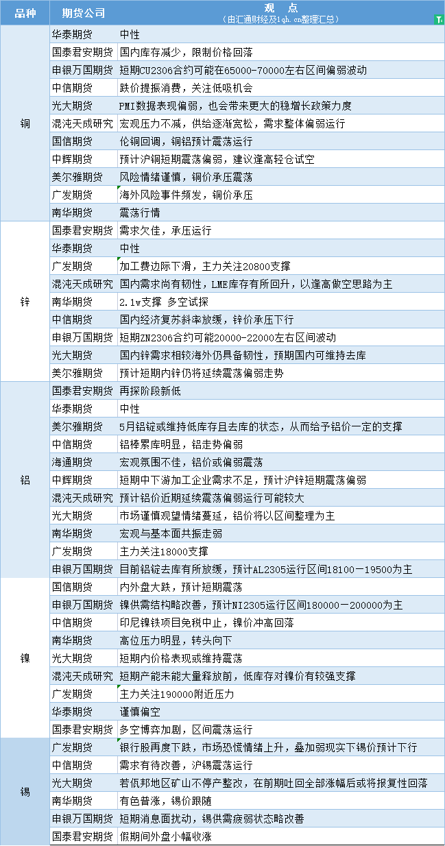 汇通财经APP讯——期货公司观点汇总一张图:5月5日有色系(铜、锌、铝、镍、锡等)