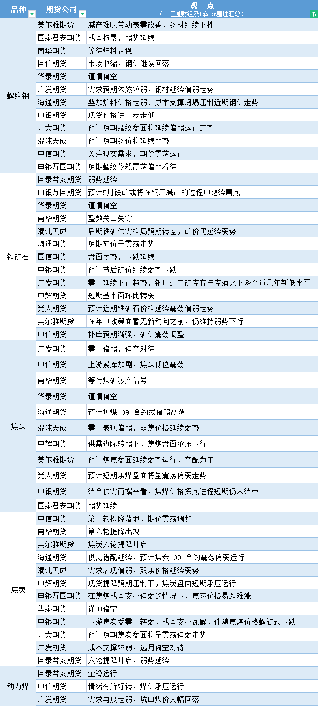 汇通财经APP讯——期货公司观点汇总一张图:5月5日黑色系(螺纹钢、焦煤、焦炭、铁矿石、动力煤等)