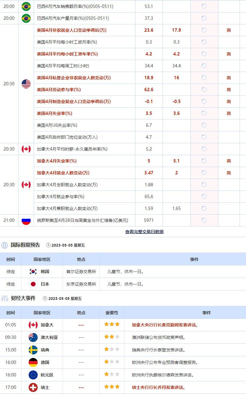 汇通财经APP讯——5月5日,投资者需要关注的重点数据:中国4月财新服务业PMI,欧元区3月零售销售月率,美国4月非农就业人口变动季调后,美国4月失业率,美国4月平均每小时工资年率,加拿大4月失业率和加拿大4月就业人数变动。需要关注的大事件包括瑞士央行行长乔丹发表讲话。此外,韩国首尔证券交易所和日本东京证券交易所因儿童节休市。