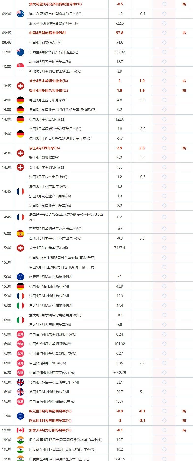 09:45 中国4月财新服务业PMI , 前值 57.8 , 预期值 -- , 公布值:待发布