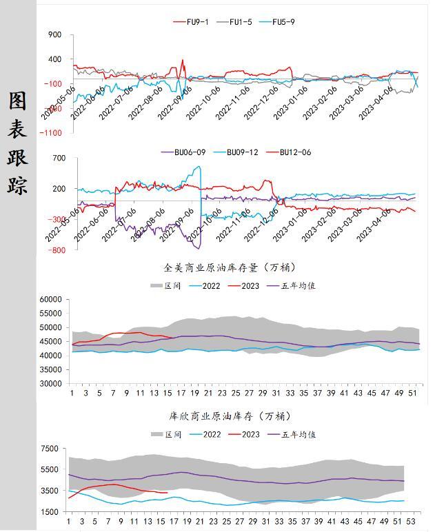 供应端:据美国能源信息署最新数据显示,截止2023年4月28日当周,包括战略储备在内的美国原油库存总量82457万桶,比前一周下降328万桶;美国商业原油库存45963万桶,比前一周下降128万桶;战略原油库存量36494万桶,比上一周下降200万桶;美国汽油库存总量22288万桶,比前一周上升174万桶。商业原油库存比去年同期高10.56%,比过去五年同期低1.91%;汽油库存比去年同期低2.49%,比过去五年同期低约6.19%;馏分油库存比去年同期高5.13%,比过去五年同期低12.51%。