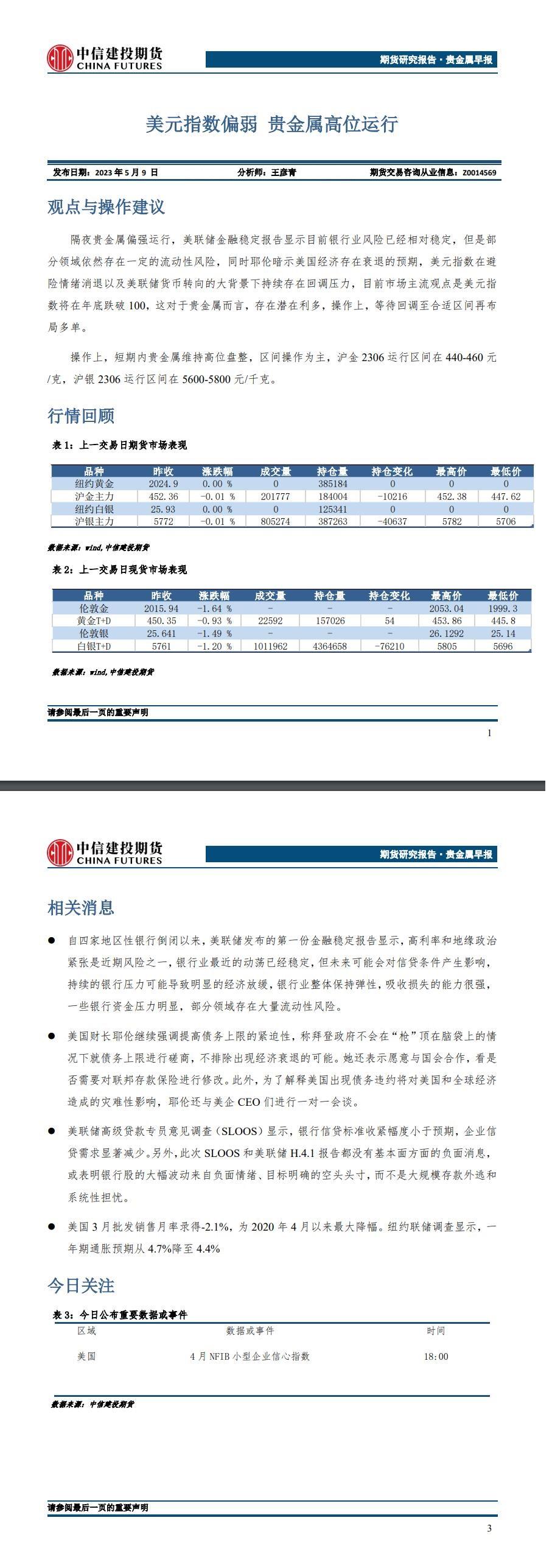 标题:中信建投期货5月9日贵金属早报:美元指数偏弱 贵金属高位运行
