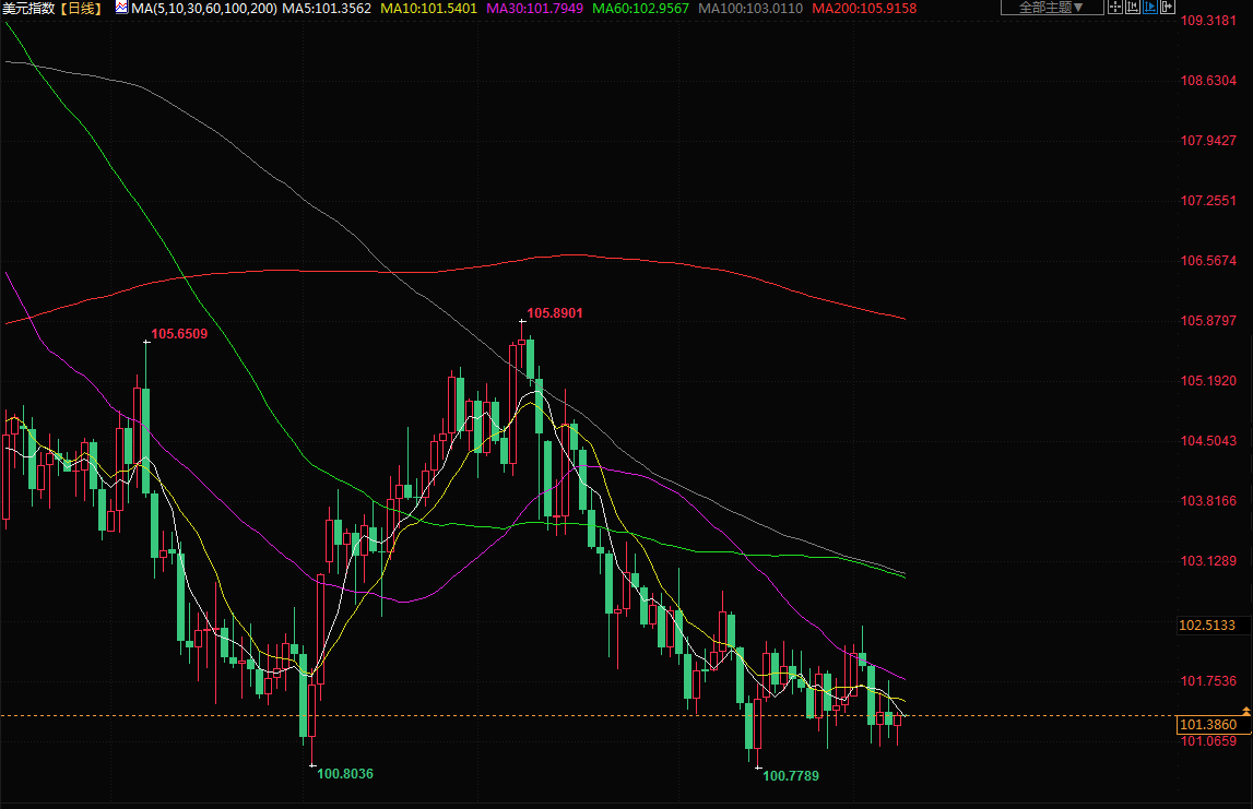 美元指数小涨0.08%,报101.38,好于上个月触及的一年低点100.78。