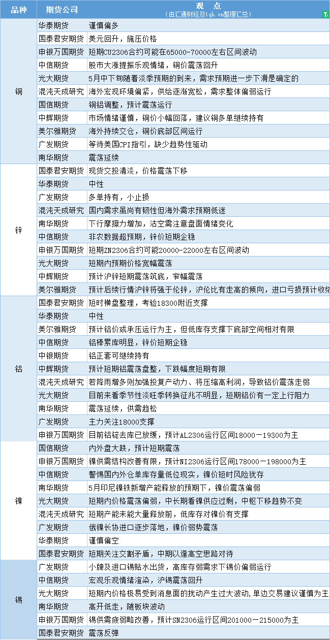 汇通财经APP讯——期货公司观点汇总一张图:5月10日有色系(铜、锌、铝、镍、锡等)