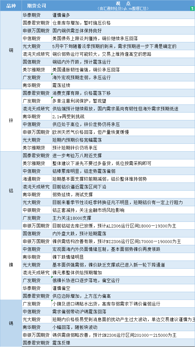 汇通财经APP讯——期货公司观点汇总一张图:5月11日有色系(铜、锌、铝、镍、锡等)