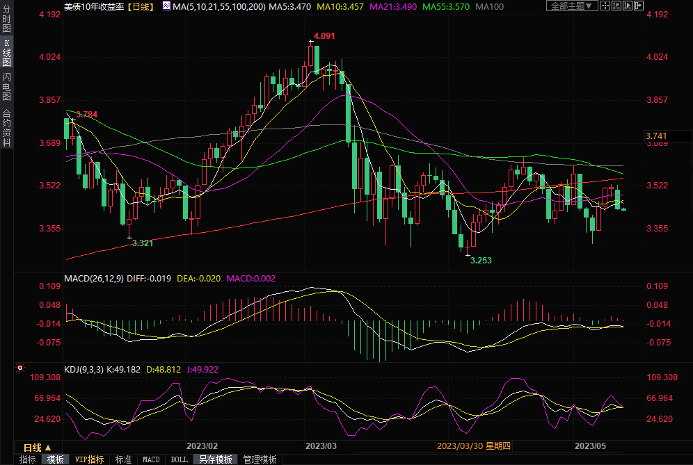 10年期国债收益率周三盘尾报3.439%,当日下跌8个基点,两年期国债收益率下跌12个基点,至3.904%。
