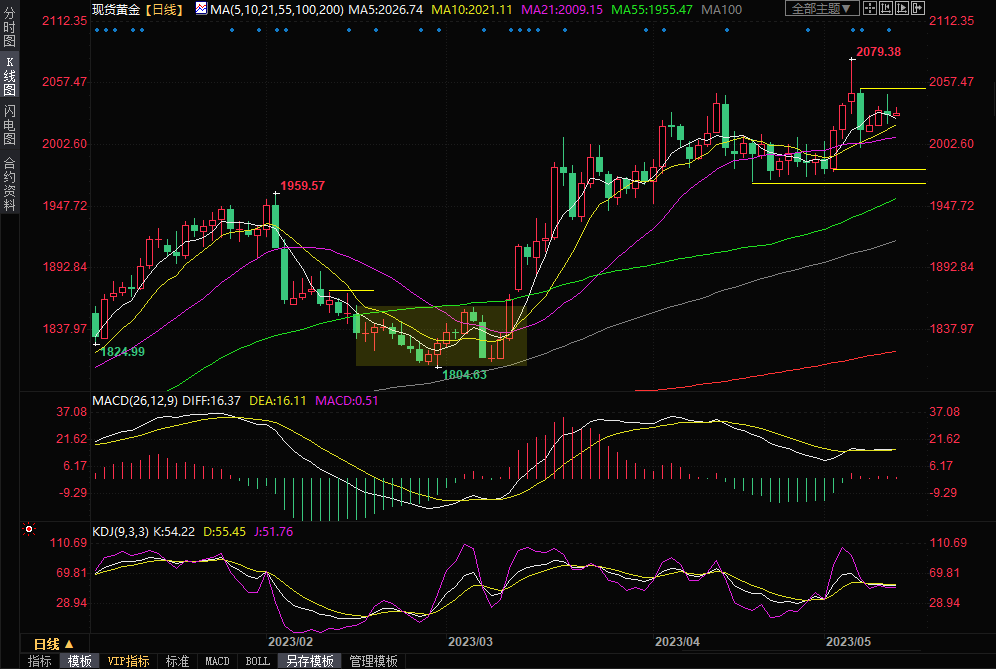 整体来看,对美国债务违约危机的担忧仍给金价提供避险支撑,但美国通胀整体依然较高,美联储不会很快降息,英国央行料将进一步加息,而且美国债务违约的概率低于2011年,金价短线偏向高位震荡运行。鉴于隔夜金价冲高回落,多头士气有所减弱,短线略微偏向震荡下行。北京时间10:24,