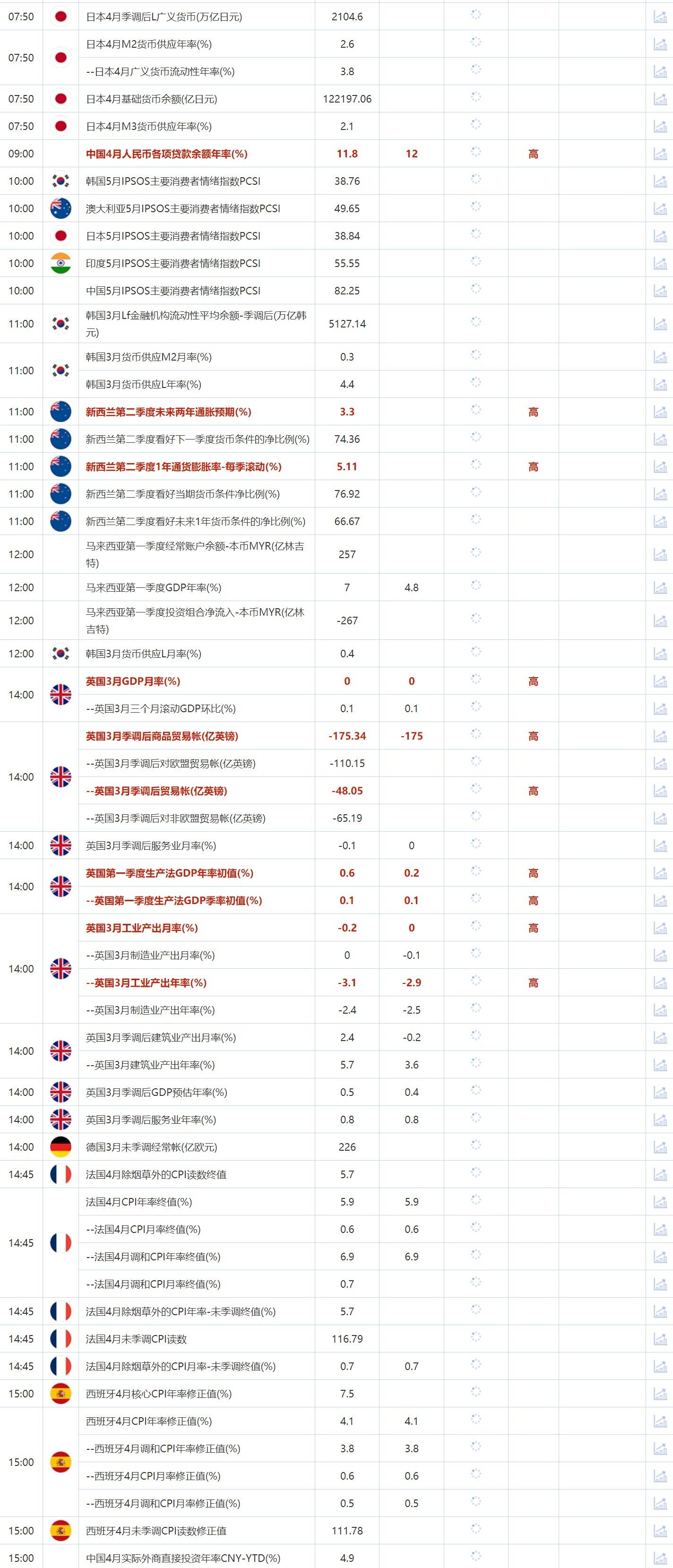09:00 中国4月人民币各项贷款余额年率(%) , 前值 11.8 , 预期值 12 , 公布值:待发布