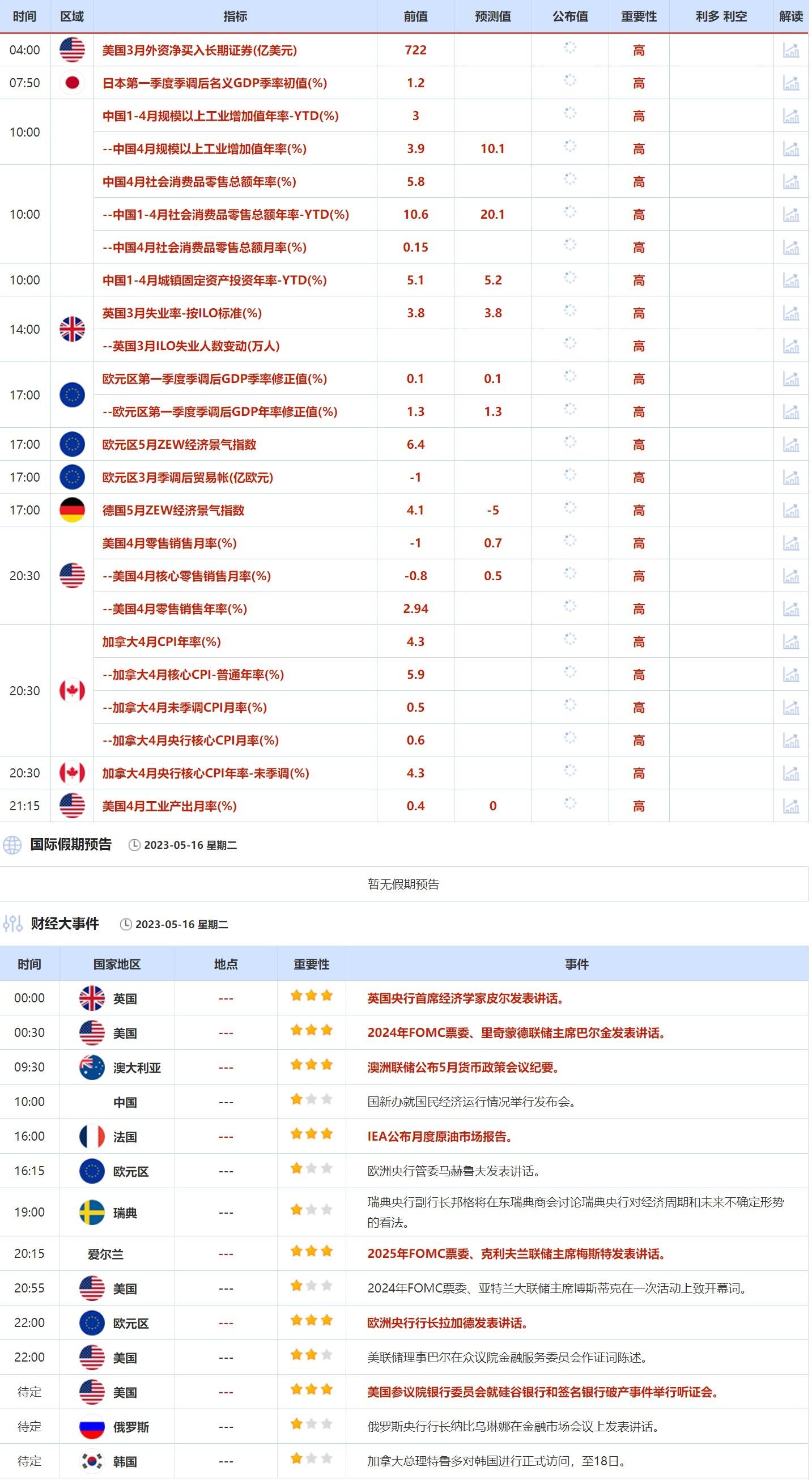 此外,5月16日,美国参议院银行委员会就硅谷银行和签名银行破产事件举行听证会,结果可能影响市场走势,投资者也需引起重视。