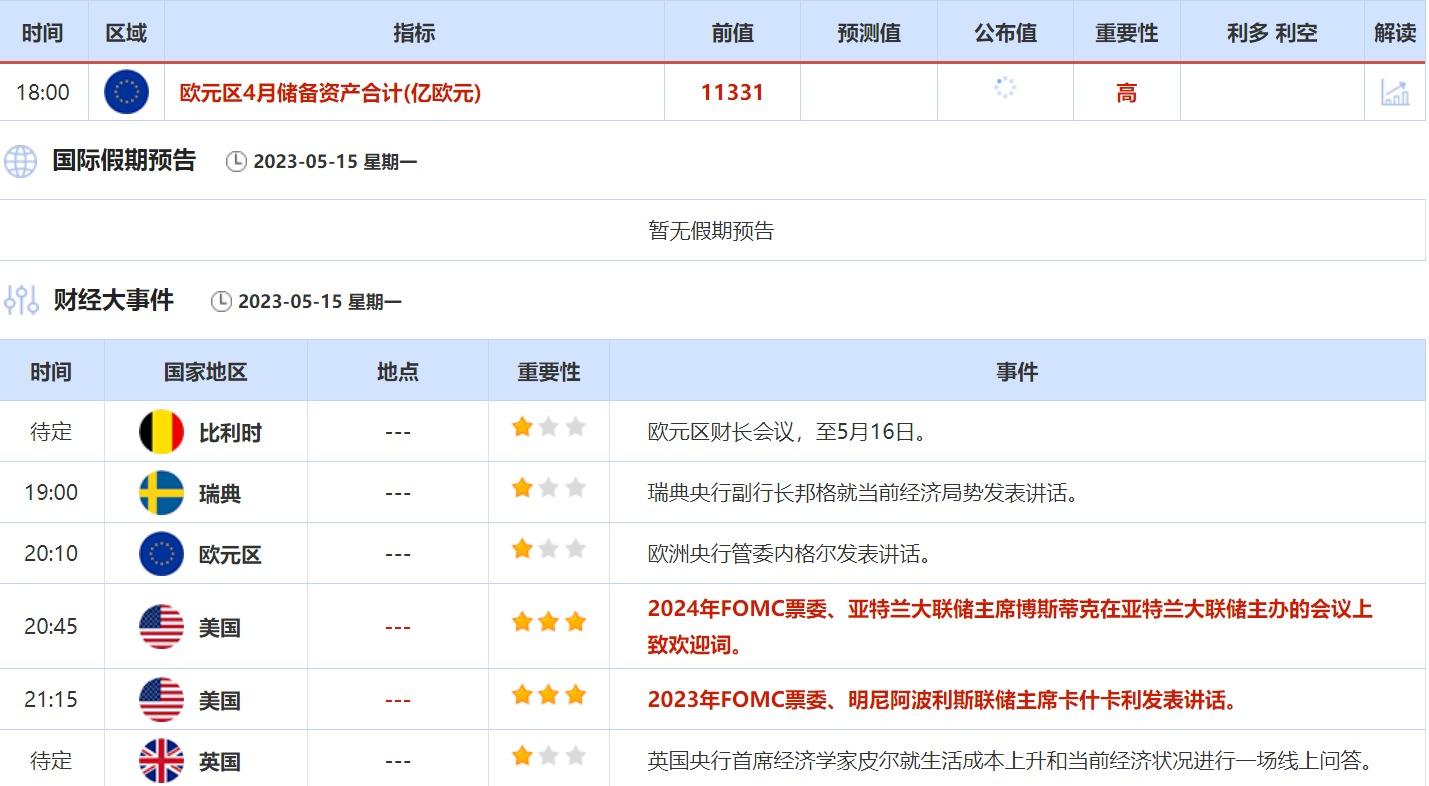 ①5月15日(周一)关键字:欧元区4月储备资产合计,明尼阿波利斯联储主席卡什卡利