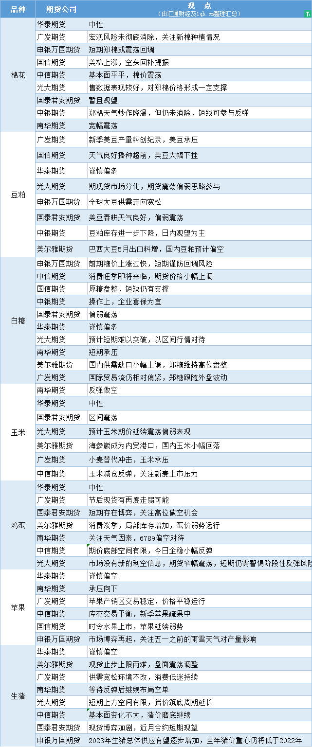 汇通财经APP讯——期货公司观点汇总一张图:5月17日农产品(棉花、豆粕、白糖、玉米、鸡蛋、生猪等)