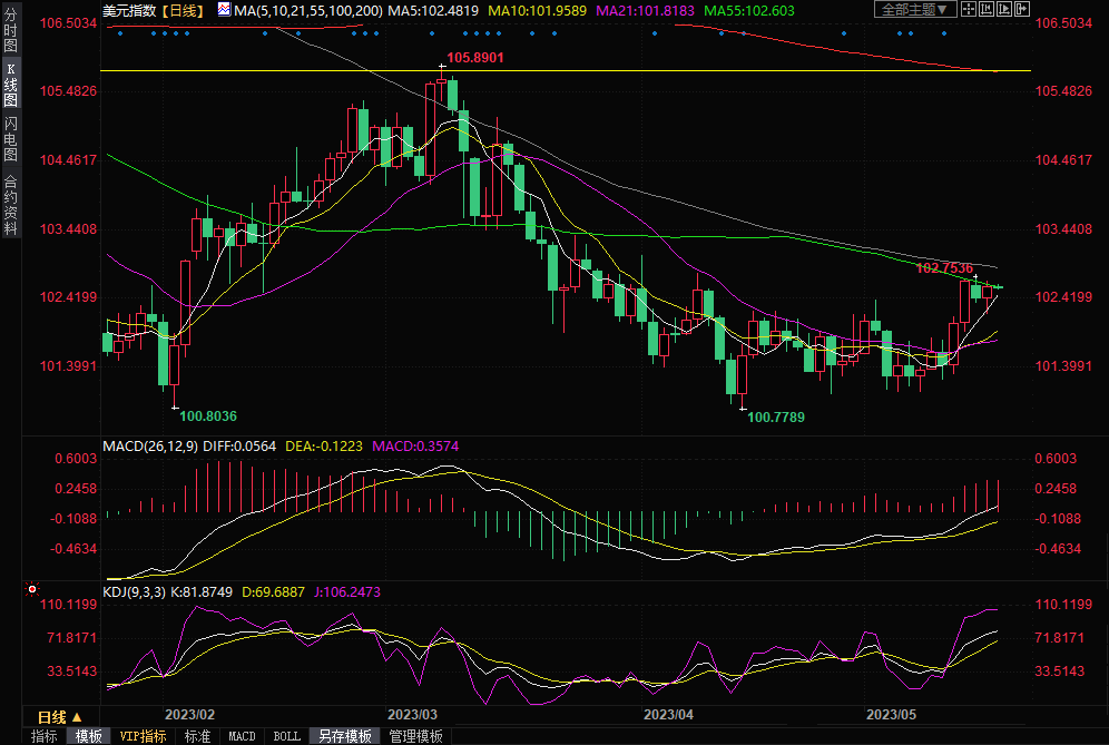 美元周二在震荡交易中小幅上涨,收报102.61,涨幅约0.17%,接近周一创下的逾一个月高点,美国经济数据相对强劲,美联储官员讲话偏向鹰派,都给美元提供支撑,市场对债务上限谈判达成协议的预期升温,也降低了美国经济衰退的风险。