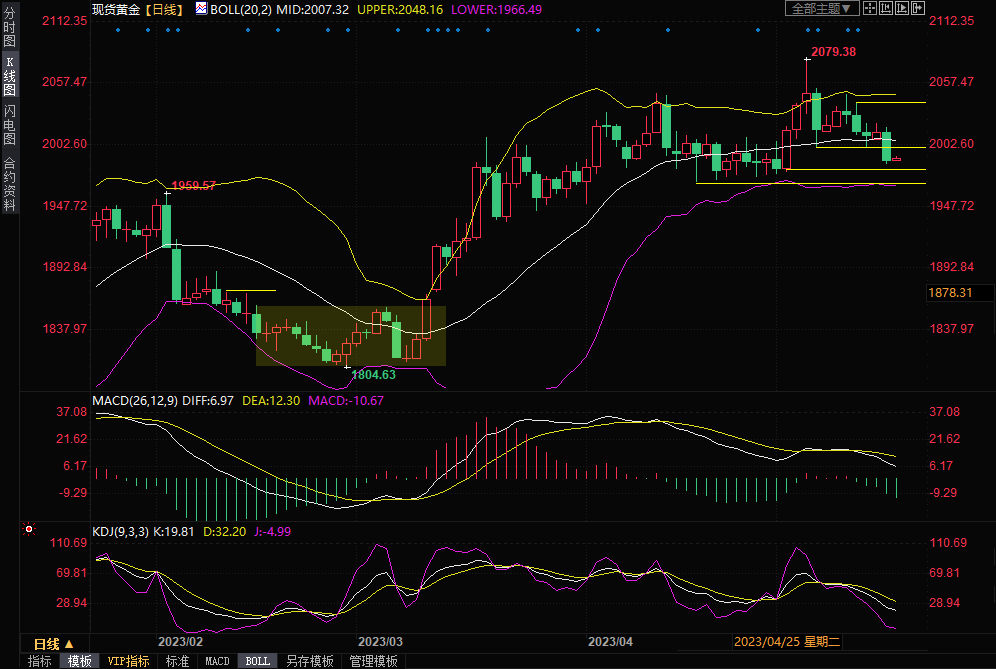 整体来看,美国数据相对乐观,美联储官员讲话相对鹰派,令美联储年内降息预期有所降温,美元和美债收益率走强,对金价打压明显,对美国债务违约和经济衰退的担忧也有所降温,进一步削弱黄金的避险买需,金价失守2000关口后,短线看空信号也有所增强劲,预计金价料将进一步下探布林线下轨1966.30附近支撑,55日均线支撑和近一个半月低点支撑也在该位置附近。北京时间09:55,