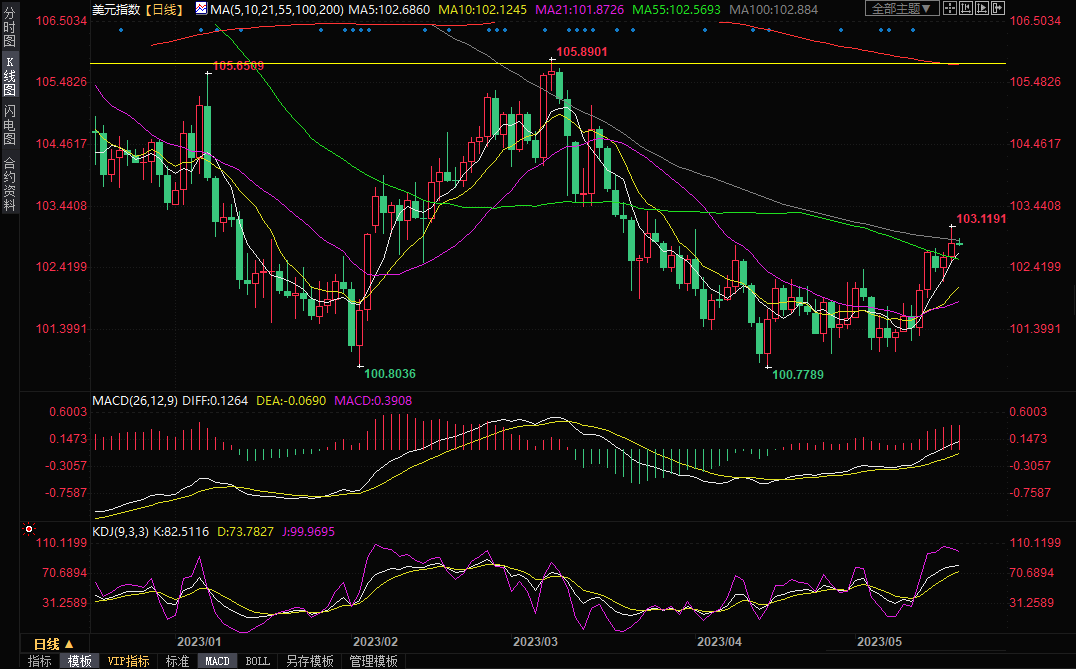 美元指数相对高位窄幅震荡,目前交投于102.88附近。美元周三升至七周高点,受延长债务上限和避免美国违约的协议的乐观情绪提振,而且一轮稳健的经济数据表明,美联储的降息可能会推迟而不是提前。
