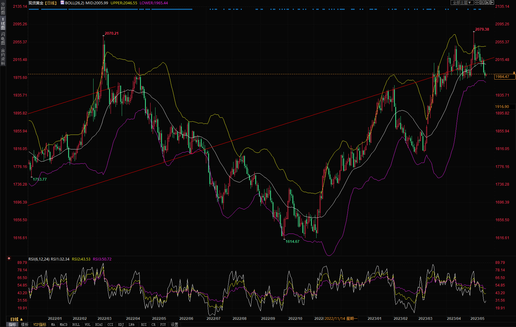 日线录得小幅阴线,短线金价持续扩大跌幅进一步处于于日线20日均线下方,当前回落幅度的逐步扩大加剧日线移动平均线向交叉向下形态,似乎维持见顶反转震荡指引参考。小时线显示,短期金价再度走低加剧短周期技术指标较为规整向下发散排列,维持小时线级别偏空排列形态,但是随机指标和RSI均出现了短线超卖迹象,或会在关键的支撑区域1970-1980美元获得相应的支撑,从而限制黄金的下行幅度。在六月欧美利率会议前,黄金跌穿1970美元强支撑线,应不以为怪。上方只有收复1990-2010美元区域,方有望扭转黄金近期的颓势。