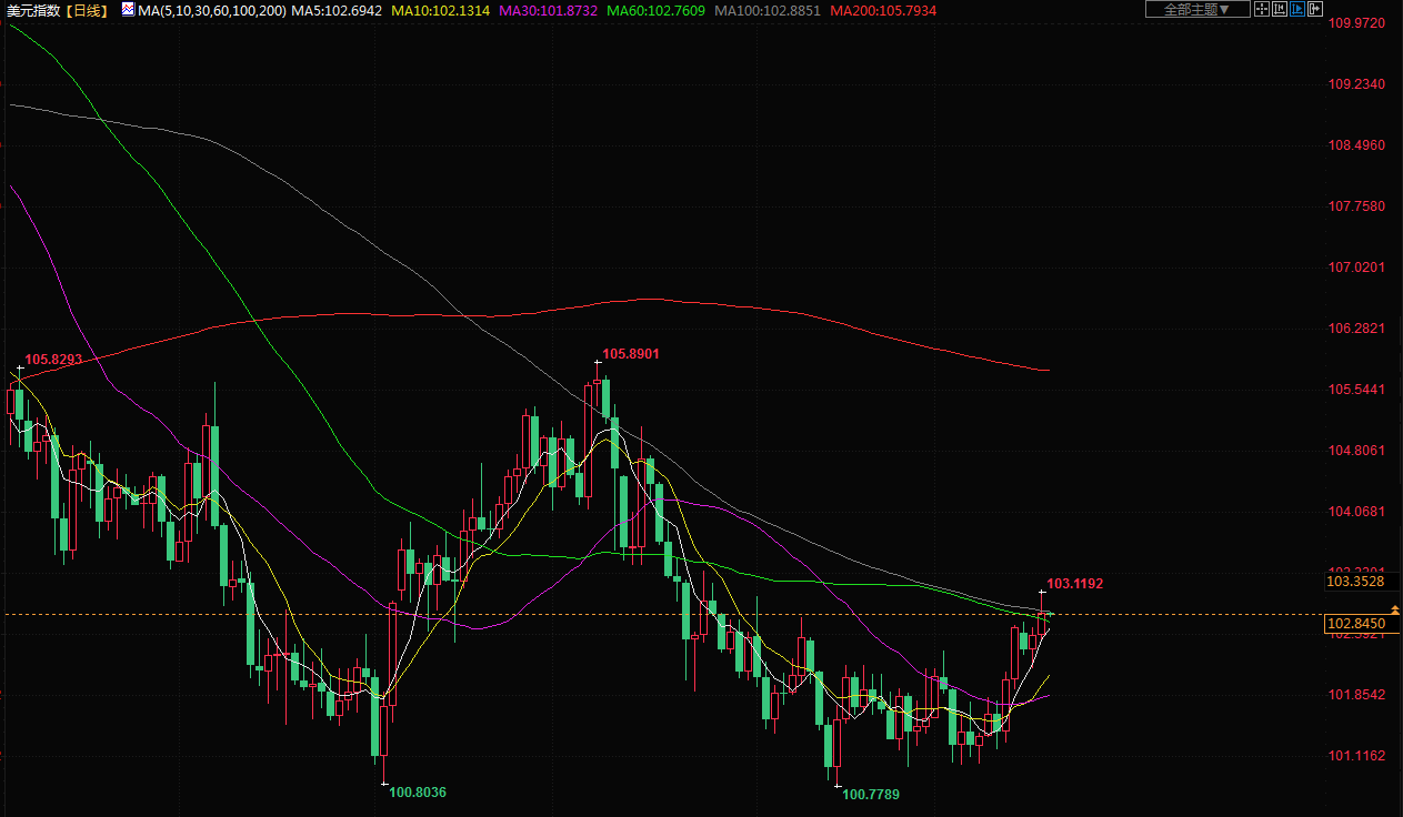 美元指数攀升至103.12,这是3月底以来的最强水平。该指数纽约尾盘上涨0.3%,报102.85。与此同时,
