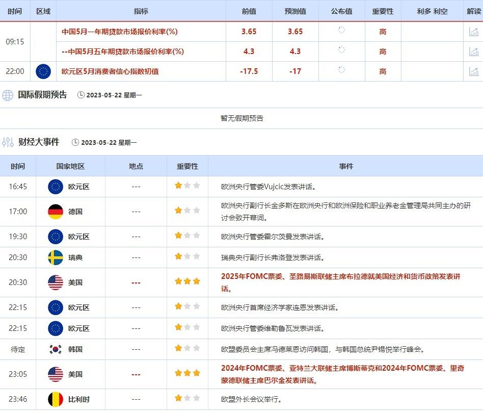 ①5月22日(周一)关键字:欧元区5月消费者信心指数初值,美联储官员讲话