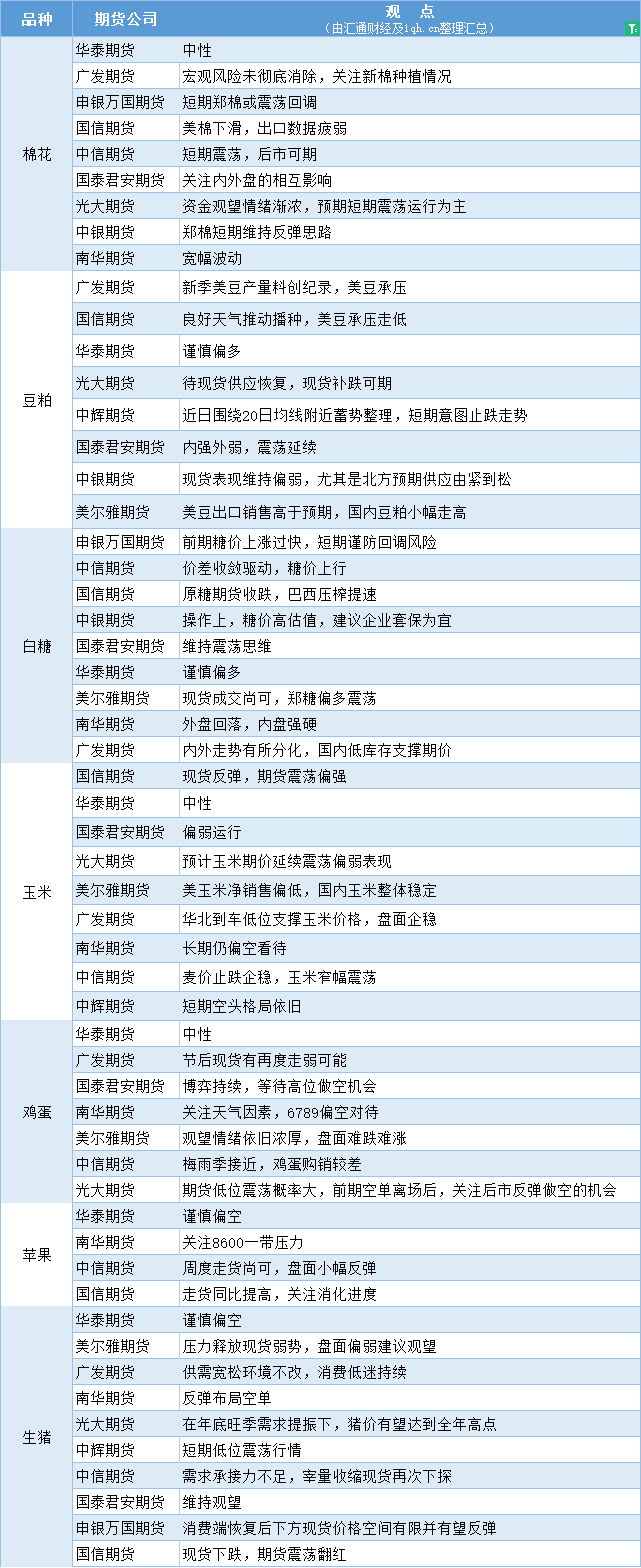 汇通财经APP讯——期货公司观点汇总一张图:5月19日农产品(棉花、豆粕、白糖、玉米、鸡蛋、生猪等)