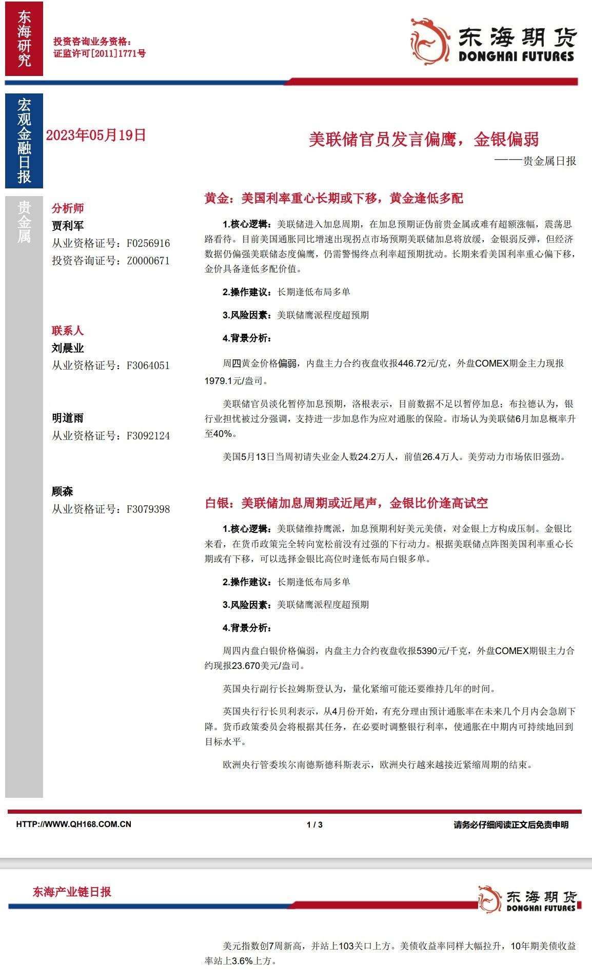 标题:【东海期货5月19日产业链日报】贵金属篇:美联储官员发言偏鹰,金银偏弱