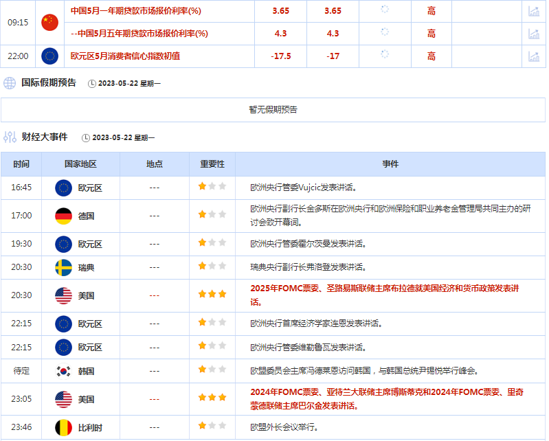 汇通财经APP讯——北京时间周一(5月22日),本周美联储将公布货币政策会议纪要,同时聚焦美国债务上限结果;关注新西兰联储和韩国央行利率决议,以及欧洲央行副行长金多斯向欧洲议会货币和经济事务委员会提交欧洲央行2022年年报。
