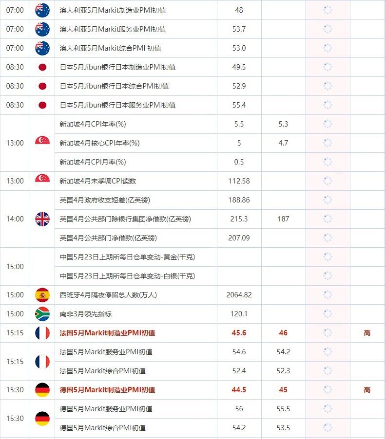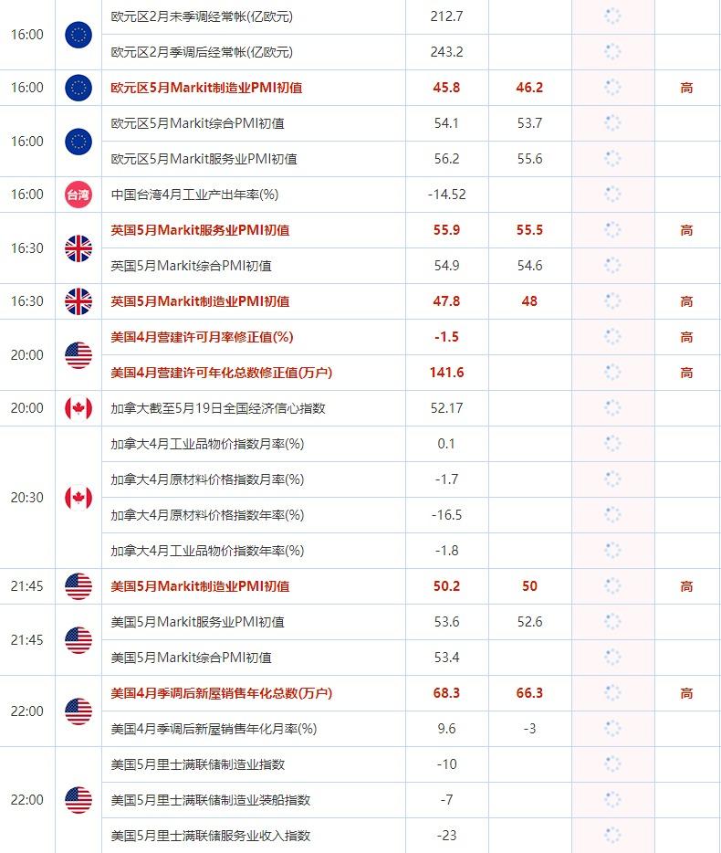 汇通财经APP讯——5月23日,投资者需要关注的重点数据:德国5月Markit制造业PMI初值,欧元区5月Markit制造业PMI初值,英国5月Markit制造业PMI初值,美国4月营建许可月率修正值,美国5月Markit制造业PMI初值,美国4月季调后新屋销售年化总数。需要关注的大事件包括欧洲央行副行长金多斯发表讲话,英国央行委员哈斯克尔发表讲话,达拉斯联储主席洛根在里奇蒙德联储主办的研讨会上致欢迎辞。