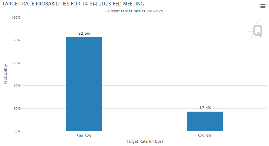 美联储5月会议纪要将于5月24日公布。CME的“联储观察”工具显示,市场目前预计,美联储在6月会议上保持利率稳定的可能性为82.6%。美联储最早将从11月开始降息。