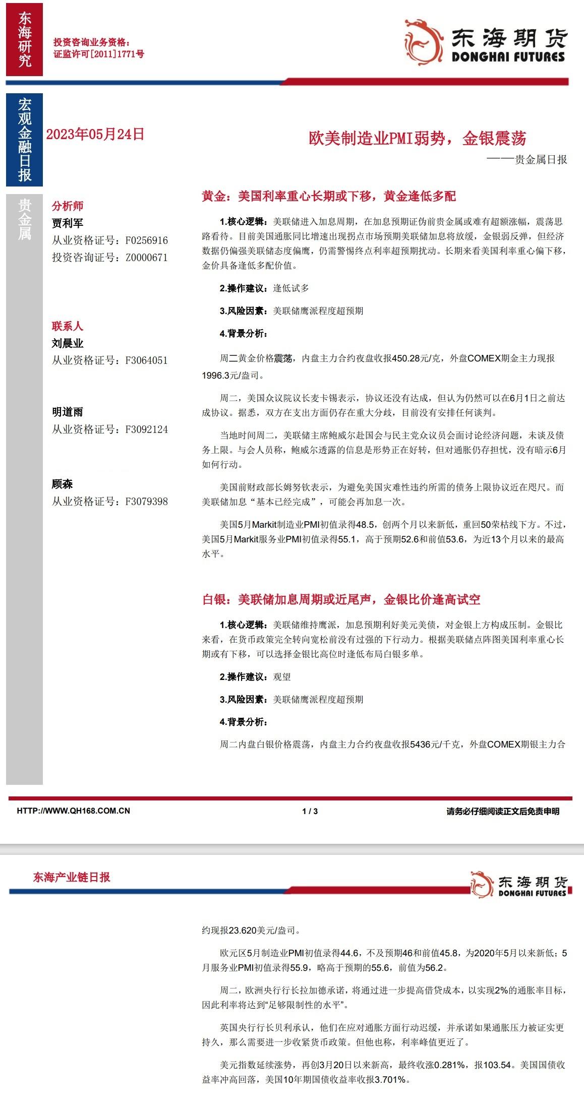 标题:【东海期货5月24日产业链日报】贵金属篇:欧美制造业PMI弱势,金银震荡