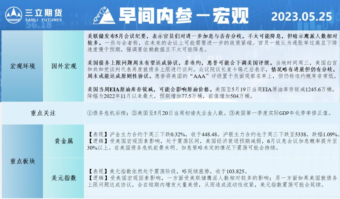 汇通财经APP讯——三立期货早间内参显示,美联储发布5月会议纪要,表示官员们对进一步加息与否存分歧,不太可能降息,但暗示鹰派人数相对较多。美国债务上限问题周末有望达成协议。若违约,惠誉可能会下调美国评级。