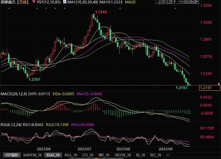 周一(9月25日),英镑兑美元下跌0.25%,收盘在1.2209,盘中最低触及1.2194,创下2023年3月以来的最低点。英国央行上周维持利率不变,这是自2021年12月以来英国央行首次维持利率不变,原因是有迹象表明经济增长正在放缓。此次会议之前的市场定价反映了这样一种预期,即即使不在此次会议上加息25个基点,也几乎肯定会在2023年再加息25个基点,但本周一,市场对今年再加息的预期大约只剩40%。这表明今年早些时候的趋势发生了逆转,当时英镑受到英国央行加息时间将长于欧洲央行和美联储的预期提振。如果接下来更多经济数据佐证英国经济陷入停滞甚至衰退之中,将会彻底解除对英镑继续加息的押注。而对于英国央行利率前景的重新评估不安情绪将会继续重压已伤痕累累的英镑。短线4小时图上,英镑/美元已呈极度超卖,或会有短线的反弹调整。日线图上,则仍旧维持明显的下降趋势。继续探低的话,下方1.20整数关口将会是空头进击的目标。短线若有调整的话,上方1.23是初步较强的阻力所在。