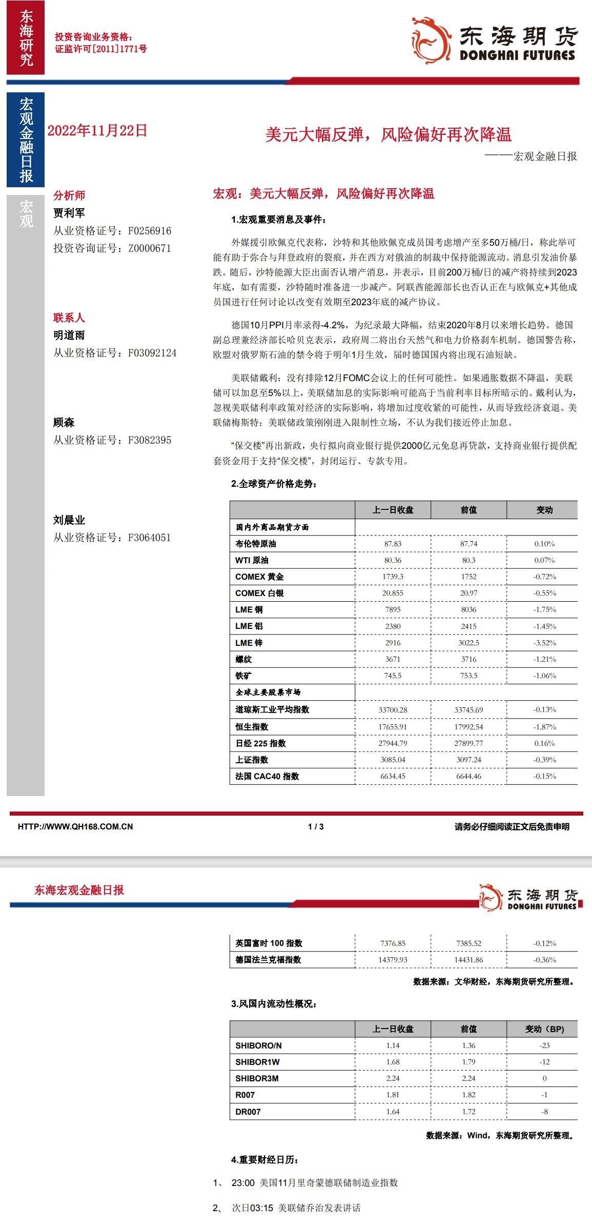 标题:【东海期货11月22日宏观金融日报】:美元大幅反弹,风险偏好再次降温