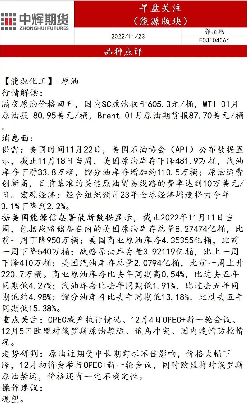 11月23日,中辉期货发布能源早盘关注,称12月初将举行OPEC+会议,同时欧盟将对俄罗斯原油禁运,价格还有一定不确定性,建议观望。中辉期货公司授权文本由“专注期货开户交易及专业行情分析资讯网站”:【一期货 www.1qh.cn】转发