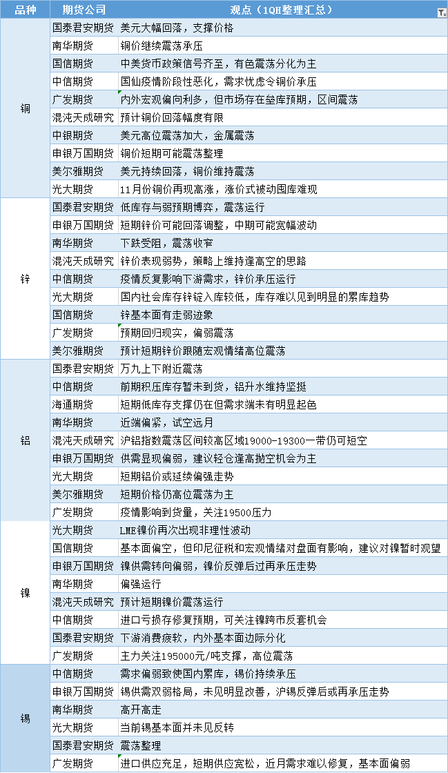 期货公司观点汇总一张图:11月24日有色系(铜、锌、铝、镍、锡等)